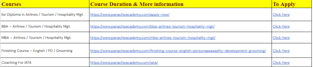 Comprehensive Curriculum: Panache Academy offers a wide range of courses, including a Diploma in Airlines/Tourism, a BBA in Airlines/Tourism/Hospitality Management, an MBA in Airlines/Tourism/Hospitality Management, and Certificate courses in Cabin Crew Training, Airport Management, and Hotel Management. The curriculum is designed to equip students with the necessary skill sets to excel in the aviation and hospitality sectors.
